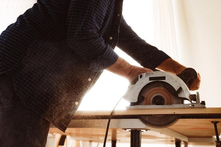 An easy way to check your stance is to correct it by closing one eye at a time. When you close one eye, you should have a clear view over one side of the saw blade, and when you switch to close your other eye, you should see the opposite side.