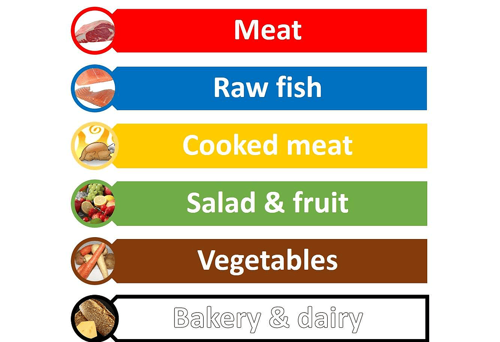 Care homes or catering establishments may have industrial sized fridges or several fridges. There should be a plan or layout which you can follow to make sure you store foods correctly