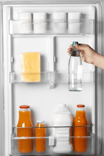 Any storage shelves in the fridge door will experience the highest temperature as they are open to the air every time the fridge is opened.You should never store high risk foods like raw meats or cooked prawns in the door.Make sure any items in the door are well secured. Falling glass jars can be a real hazard.It is recommended that milk is stored on the top shelf. But if it doesn’t fit and you have to store it in the fridge door be extra careful and buy smaller cartons more often to reduce the chance of it going off.