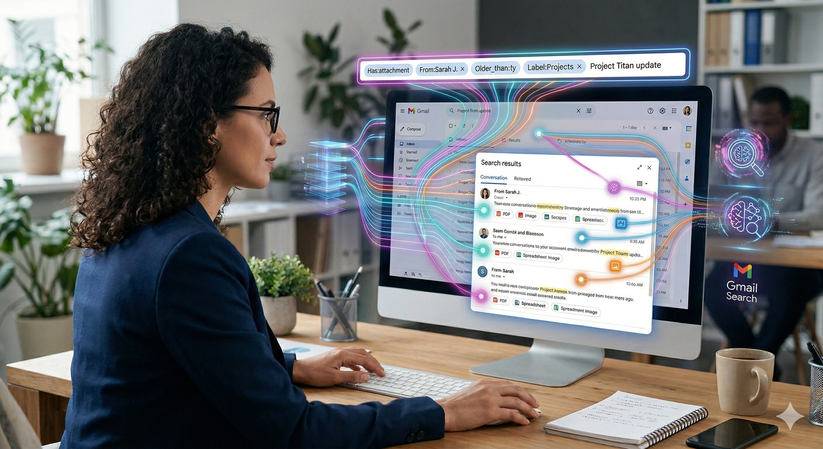 Natural Language Queries: Instead of using complex search operators (like from:name has:attachment), simply ask:
