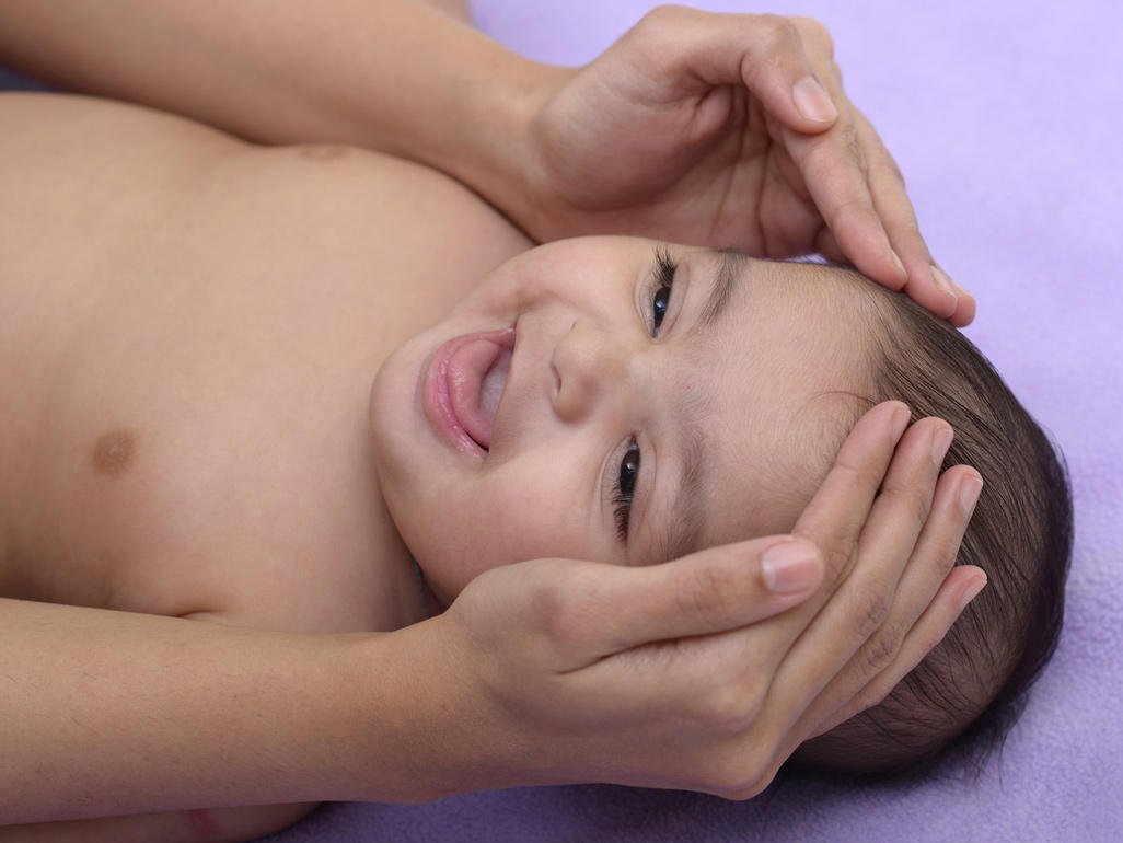 Touch the forehead, temples and the base of the cranium, eyebrows and eyelids, nose, cheeks, the area around the mouth, ears and surrounding area Jaws The frontal part of the neck (Remember doing this very gently).Make small strokes and massage the posterior part of the neck with slow movements down to the shoulders. Softly put both hands on his/her shoulders. Caress the baby from the neck to the shoulders in the direction of his chest.